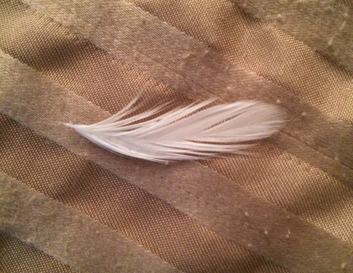 Then, all of a sudden, I looked down and there it was – a white feather! This has only happened to me once before – years ago in church. The Lord uses so many ways to remind us He is there; that He loves and cares for us!