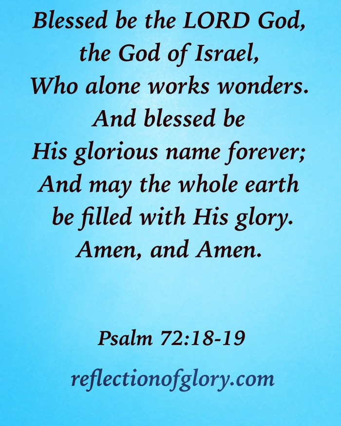 Psalm 72:18-19 March 4, 2016 Tina K. Roach Uncategorized Share this: Click to share on Facebook (Opens in new window) Facebook Like Loading...