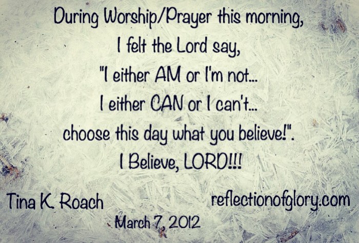 I Believe, LORD!!! March 7, 2019 Tina K. Roach Christianitychoice, God, Holy Spirit, Jesus, Lord, Prayer, trust, worship Share this: Click to share on Facebook (Opens in new window) Facebook Like Loading...