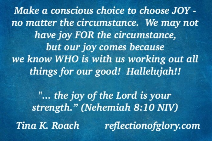 Choose JOY! March 26, 2019 Tina K. Roach Christianityfocus, God, Holy Spirit, hope, Jesus, joy, Lord, strength, trust Share this: Click to share on Facebook (Opens in new window) Facebook Like Loading...