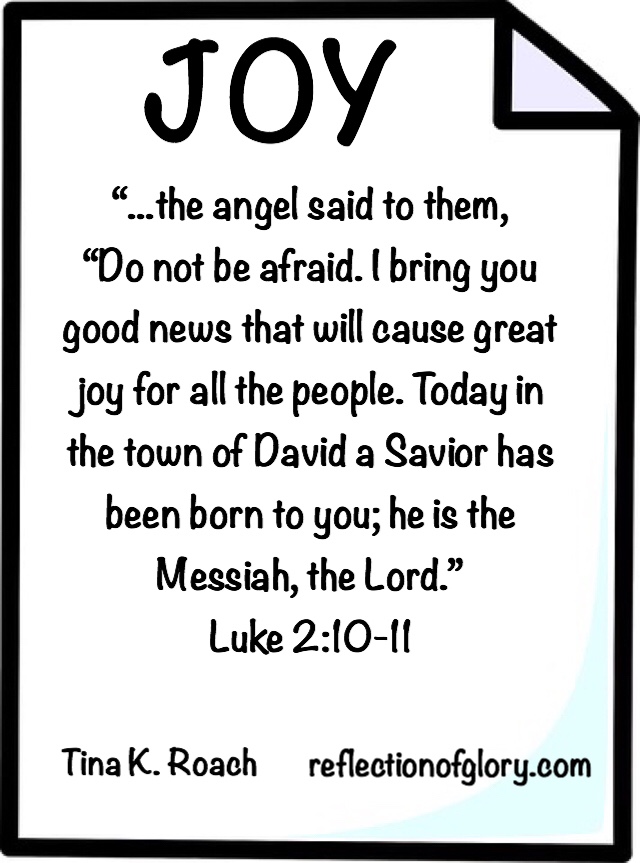 JOY (Luke 2:10-11) December 16, 2019December 16, 2019 Tina K. Roach ChristianityChristmas, fear, God, Holy Spirit, Jesus, joy, Lord, Messiah, Scripture Share this: Click to share on Facebook (Opens in new window) Facebook Like Loading...
