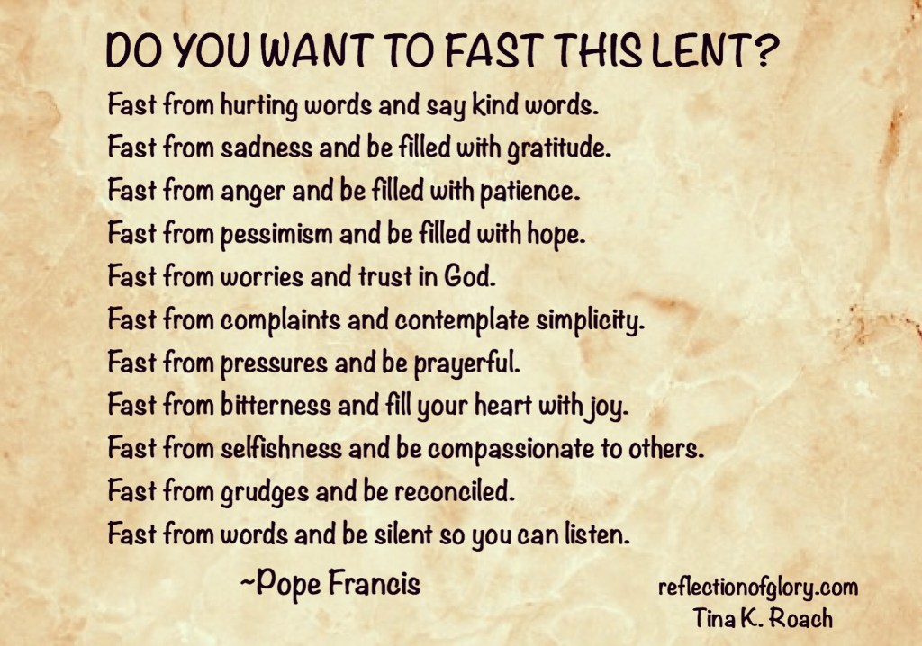 DO YOU WANT TO FAST THIS LENT? February 27, 2020 Tina K. Roach Christianityfast, focus, freedom, God, Holy Spirit, hope, Jesus, Lent, life, Lord, peace, sacrifice Share this: Click to share on Facebook (Opens in new window) Facebook Like Loading...