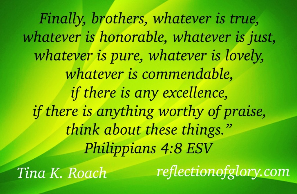 Finally, brothers, whatever is true, whatever is honorable, whatever is just, whatever is pure, whatever is lovely, whatever is commendable, if there is any excellence, if there is anything worthy of praise, think about these things.” Philippians 4:8 ESV