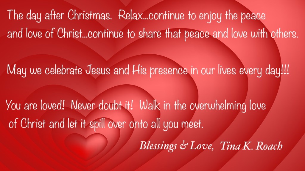 Day After Christmas… December 26, 2024 Tina K. Roach Christianityaction, Christ, God, Holy Spirit, Jesus, Lord, love, peace, walk Share this: Click to share on Facebook (Opens in new window) Facebook Like Loading...